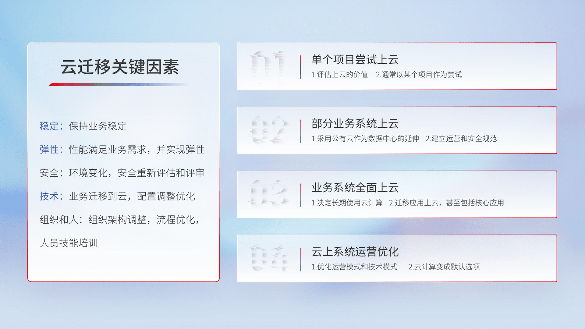 结合实际业务,,,从规划设计、、云平台选型、、云原生改造、、、数据迁移、、集成交付,,,迁移全过程为客户识别最佳上云路径,,,,做好风险识别管理,,,,设计网络架构、、、身份权限、、安全审计合规、、、操作审计、、日志审计、、、、监控告警策略、、、、多站点容灾设计等,,,对云上基础设施进行整体规划,,,,提升IT治理水平,,,以满足弹性、、高可用、、、、高性能的需求。。。