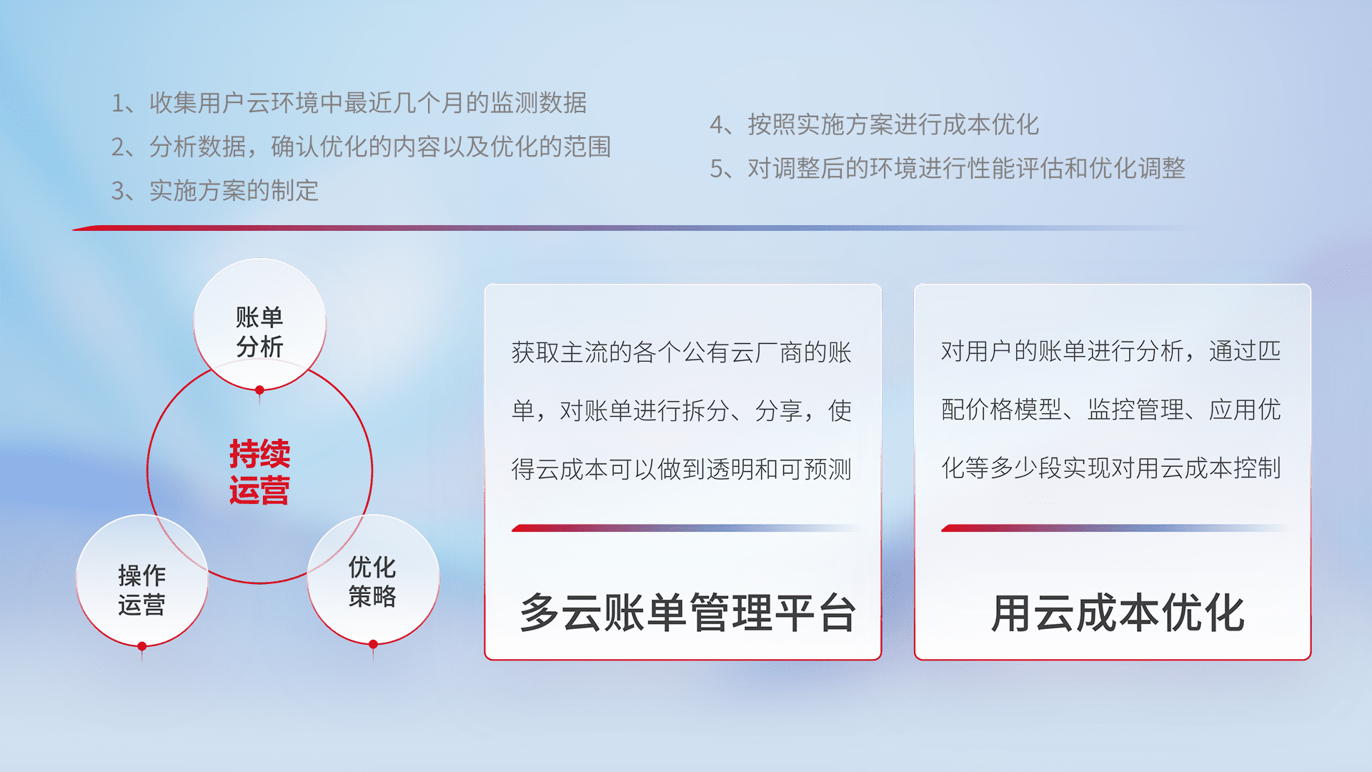 通过多云纳管,,,,以统一的资源数据模型把客户的云资源进行抽象和封装,,进而实现对多云资源的统一操作,,,保障云资源管理的可靠性、、稳定性与可用性。。。量身定制化运维内容,,,配置、、开发运维、、、补丁管理、、、备份、、监控、、、认证和访问管理、、、审计和日常巡检等,,,保障在用云过程中的可靠度,,稳定度以及高可用率。。。